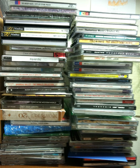I’m so torn! Do I try to read all of Brad’s fabulous posts or do I try to rip all of these CDs that have been sitting on my desk for several weeks now? Hmmm. For the record (heh!), there isn’t much prog here. However, the prog that is in the pile is a bit obscure: “Olias of Sunhillow” by Jon Anderson (1976). Also a Jon and Vangelis album, “Chronicles” (1994), which is probably construed as “New Age”. As well as some Traffic (“Far From Home” and “John Barleycorn Must Die”), Massive Attack (“Protection”), Moody Blues (“Days of Future Passed”), and a bunch of jazz (Monk, Marcus Roberts, Lee Ritenour, Stanley Jordan, David Sandborn, John McLaughlin, George Benson, etc.). Oh, and some good classical: the complete symphonies of Haydn (Adam Fischer with the Austro-Hungarian Haydn Orchestra) and Britten’s “War Requiem”. Dare I mention the guilty pleasures? Van Halen’s “Diver Down”, Spandau Ballet’s “Singles Collection”, 2nd Chapter of Acts (Best of…), and Boston (“Greatest Hits”).