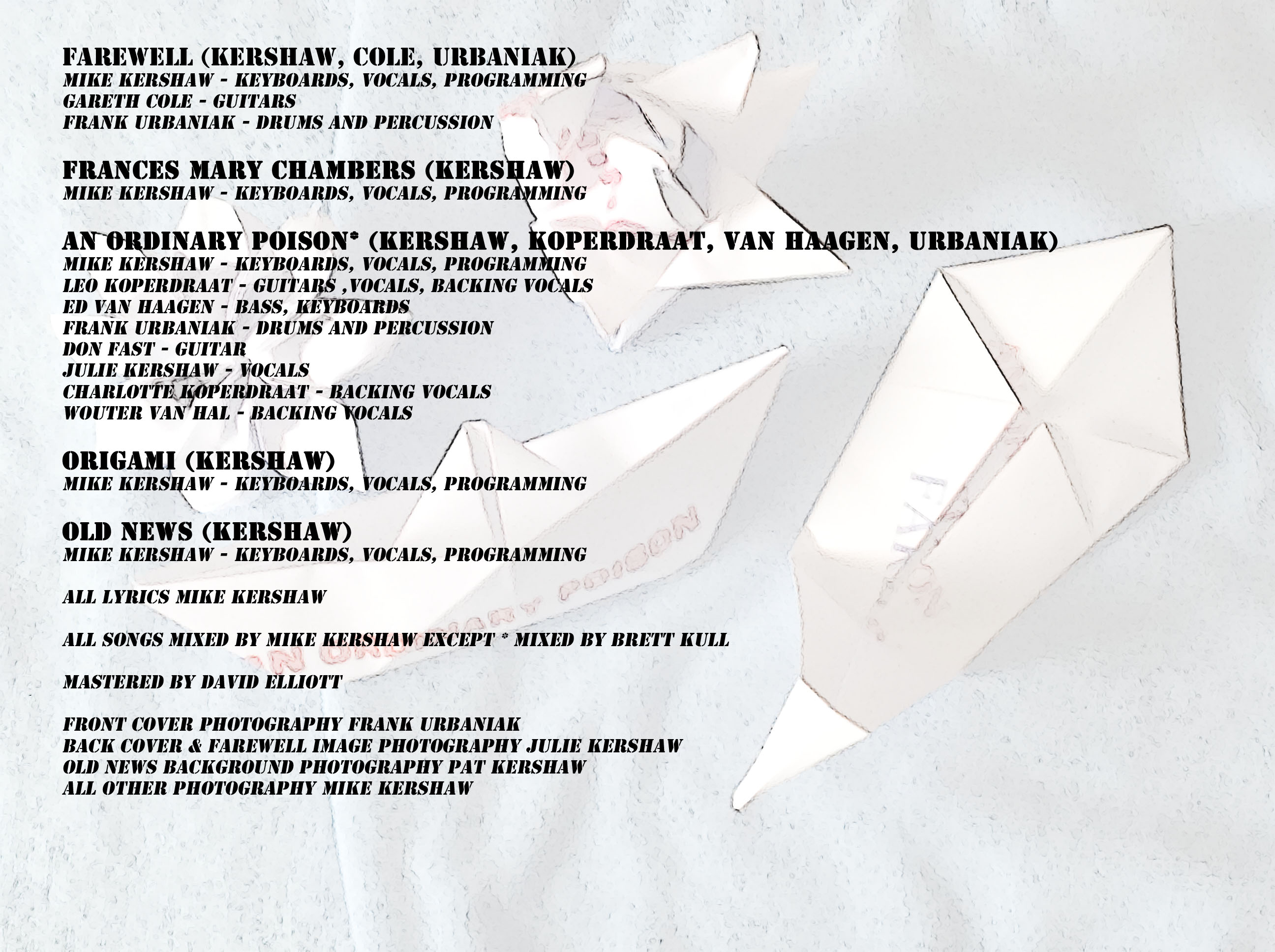 Thematically, Departure is not as structured as Ice Age, presumably because it is a shorter EP, and because not every song here is new. The song “Origami” was recorded during the Ice Age sessions, and “An Ordinary Poison,” which was recorded with Fractal Mirror, is a re-recording of an older song Mike Kershaw made. This is also especially good. Overall, the EP is heavily synth driven, just like Mike’s earlier work. It seems like there is a little more guitar work here as well, which I think is a nice improvement. Frank Urbaniak’s drums are fantastic, bringing a smooth rhythm and driving beat to the music. The added vocals from Fractal Mirror’s Leo Koperdraat, among others, was a nice added touch. As always, Mike’s deep, quiet vocals add a wonderful sense of contemplation to the music.