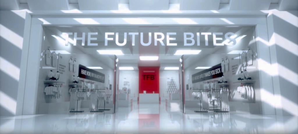 (This is as good a time as any to mention that the physical “Limited Edition Deluxe Box Set” takes the mordant glee of “Personal Shopper” to an even more extravagant level. Along with the main album, instrumental disc and bonus content on CD and “obsolete media”, you get: stickers! [“Making it easy for people to be aware of your financial investment in this branded product.”] A warranty! [“Your guarantee is unique to you and has a unique identification number. Which makes you just like everybody else.”] A consumer survey! [“Would you recommend The Future Bites to your friends? To your enemies?”] Product reviews! [“What I really wanted was the same product as The Future Bites made the last time, but under a slightly different name.”] Ads for the rest of the TFB product line, including a credit card pre-loaded with debt! It’s a giggly, absurd high-concept design parody of . . . high-concept design. Which leaves the purchaser wondering again who the joke’s really on.)