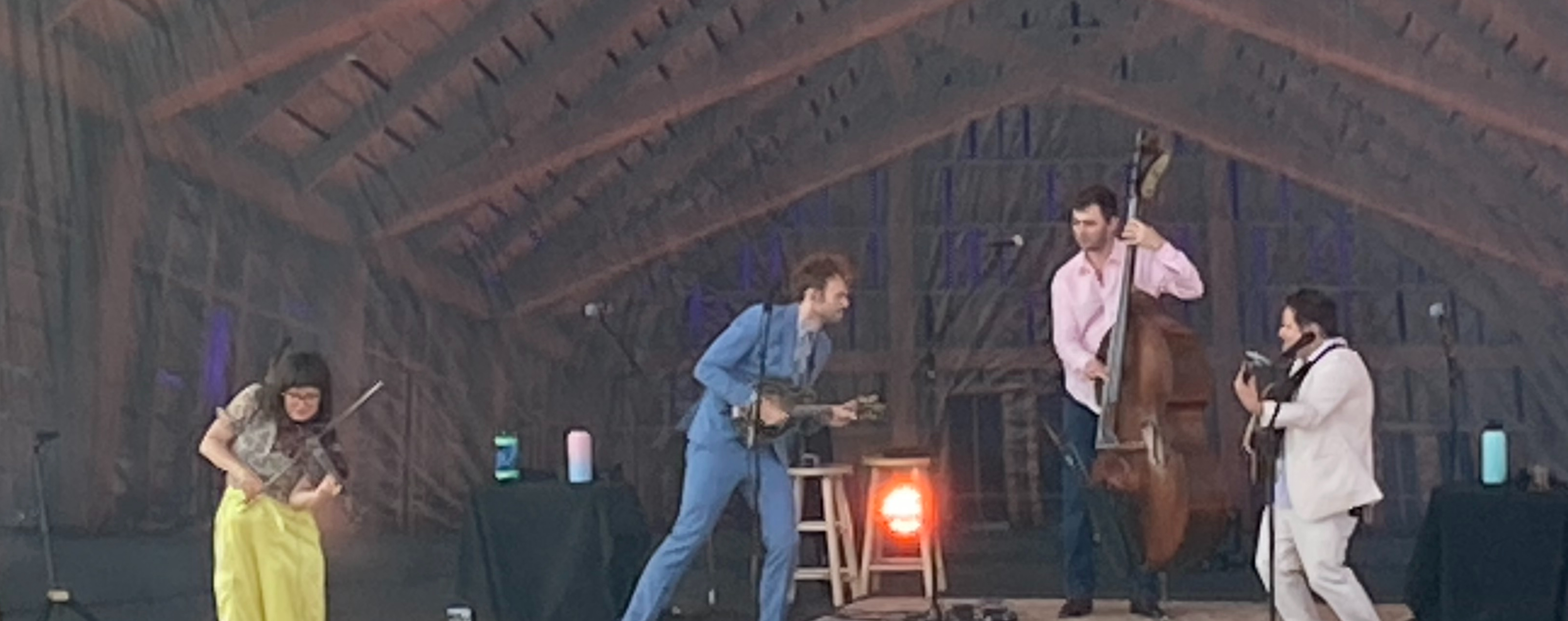 But for all the exhilaration, there was also serious joy at the heart of Nickel Creek’s set that burned bright even when the flames died down to a smolder. Along with the subdued “Strangers” and the stark final encore “Holding Pattern”, Celebrants’ title track (anchored by Thile’s 6/4 stomping and the audience’s offbeat claps) reflected on what the world had lost, then found — “Ho! for the gatherings/For having what we had again/Now that we/Know fellow celebrants/What the hell it meant.” The joy of reunion after enforced absence simply couldn’t be contained; it was there throughout the night — in Thile’s virtuosic solos and upbeat comments, in Sara’s sheer delight at the band’s first outdoor gig of the year (and her bandmates’ celebrating her birthday with onstage cocktails), in Sean’s unabashed grins, crossing his face in the midst of still more dazzling picking — and most of all, when the trio gathered around one mike for the daringly acrobatic vocal swoops of “Water Under the Bridge, Part 1”.