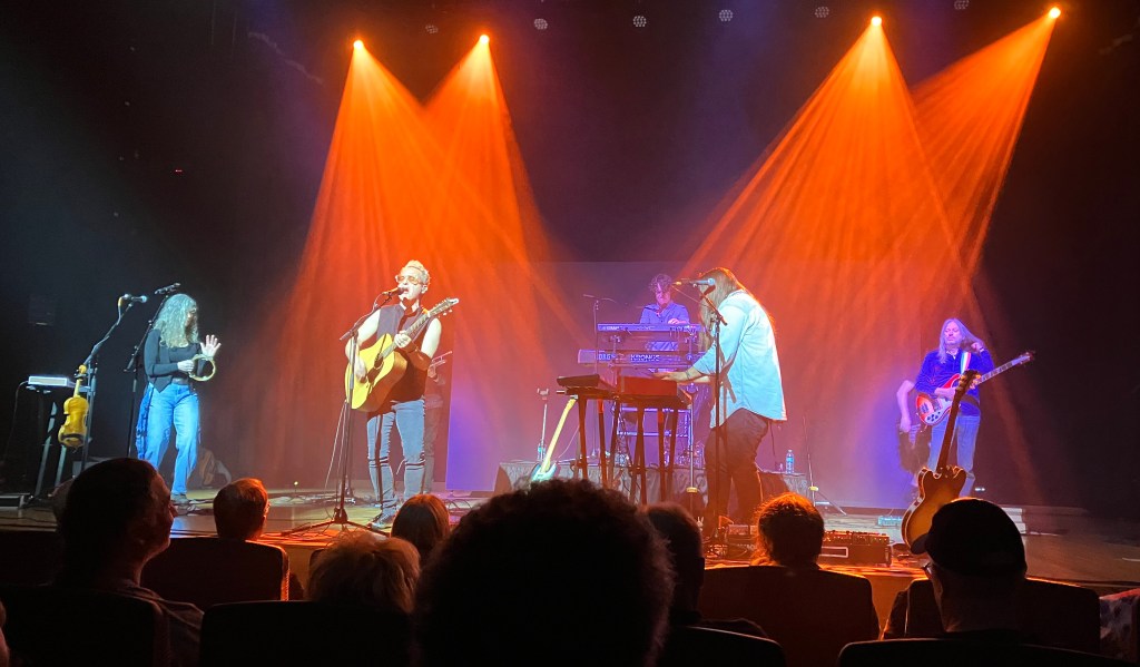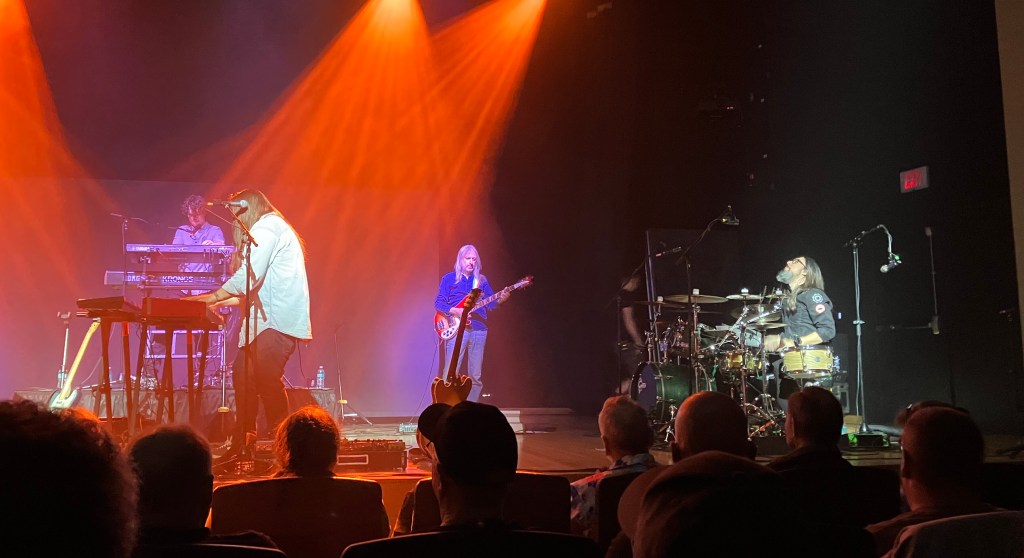 I had paid for a general admission ticket between rows C-G, and due to my place early in line, I was able to snag a brilliant seat fourth row center. I believe this was two rows closer than my seat at last year’s show. As things got going, the next round of bad weather rolled in, although you wouldn’t know it from inside the theater. The dude who introduced the band, who started a little later than the advertised 7pm, perhaps giving a chance for latecomers to show up because of the weather, commented that the auditorium was Sweetwater’s designated safe space for storms, so the show would definitely go on. The auditorium never quite filled up, which I suspect was due to the rain. They are also playing shows outside Detroit and Chicago soon, which may have limited people who would have otherwise come from those areas. But since Nick works for Sweetwater as his day job, the venue makes a great warm-up show for a tour.