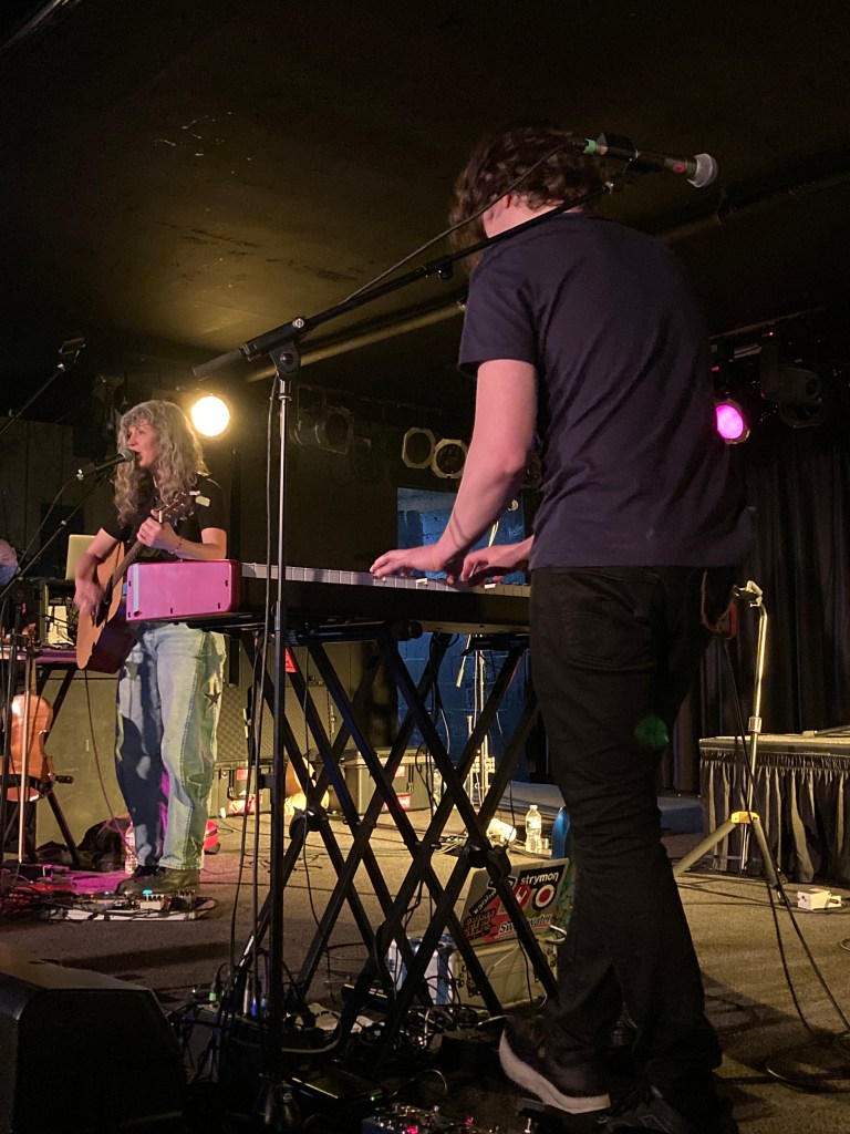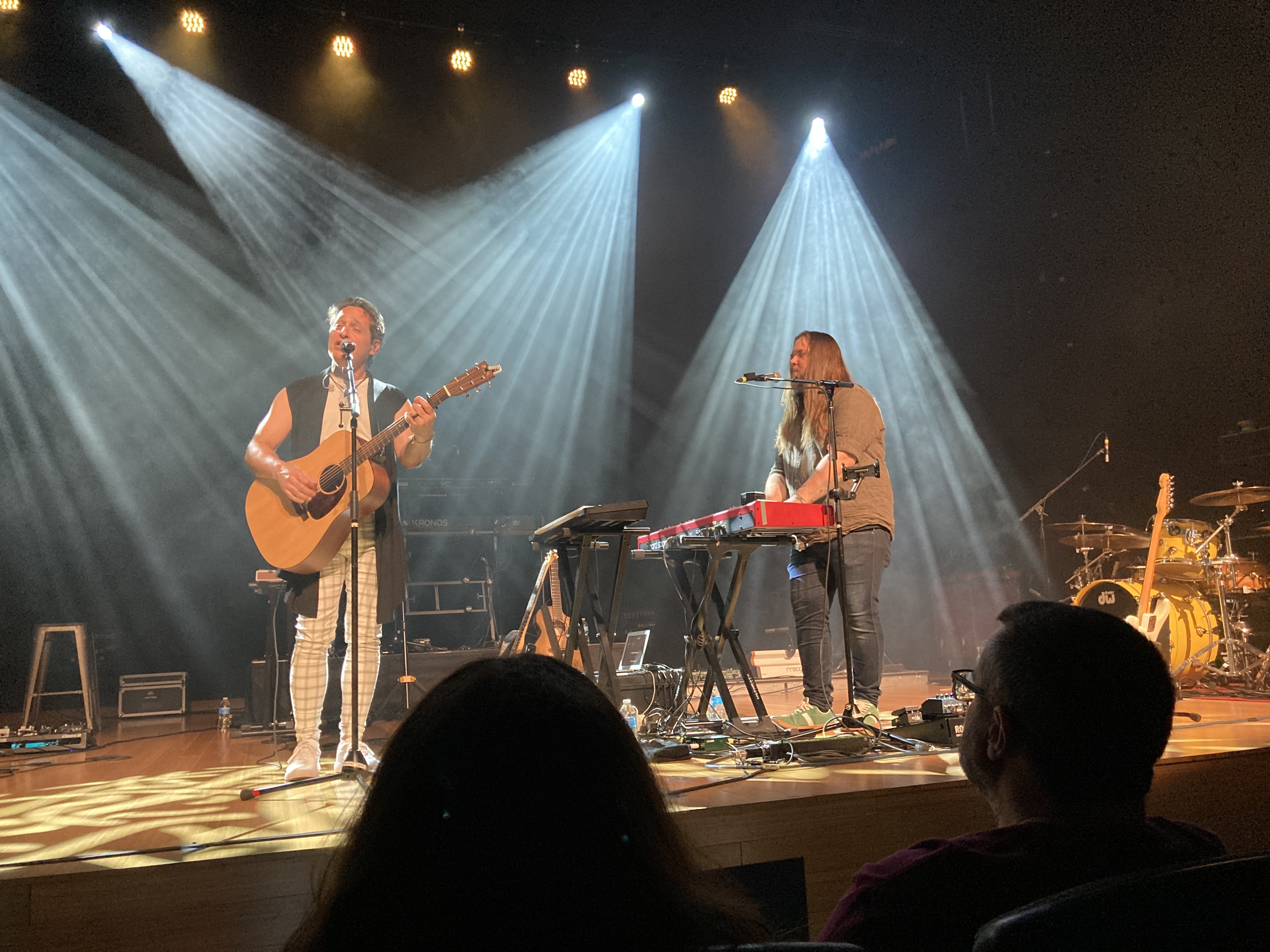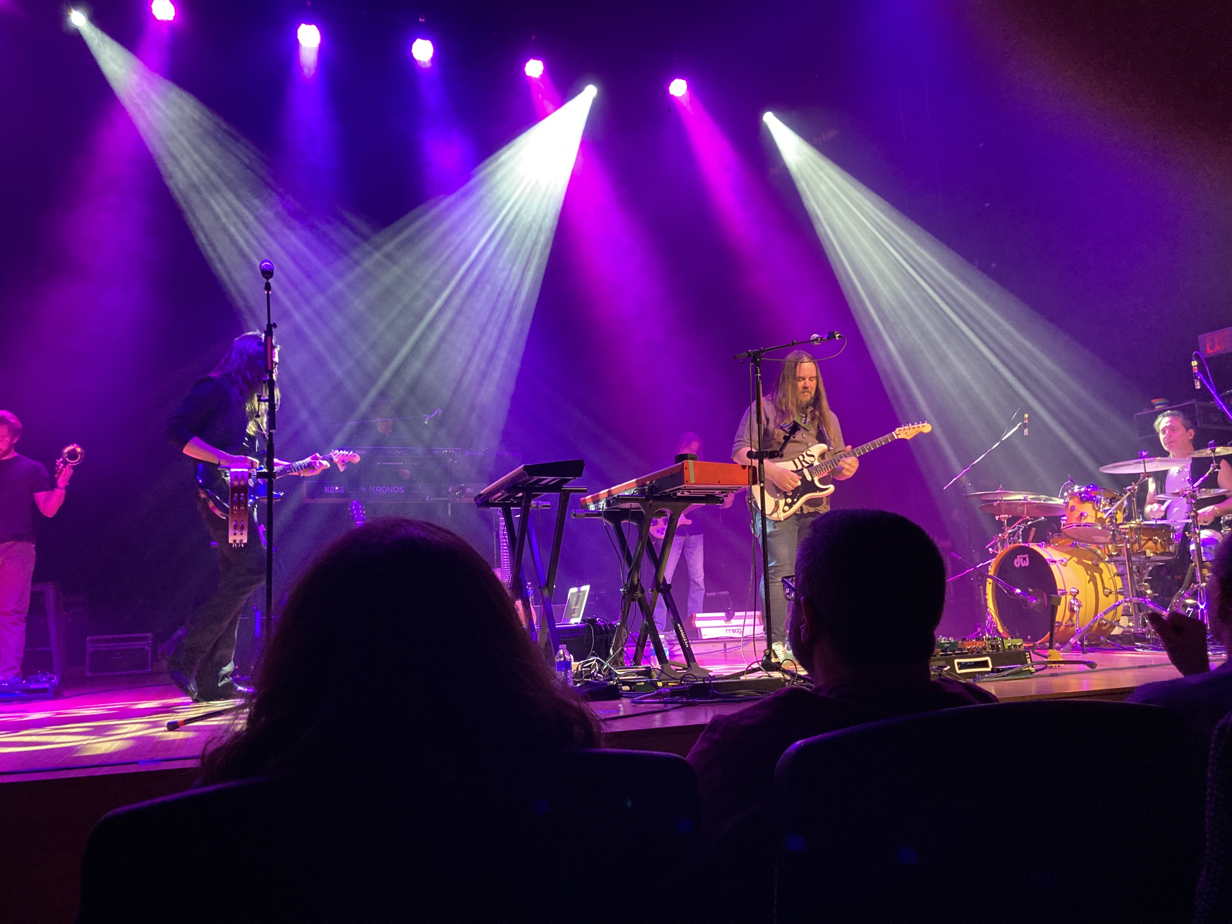I had paid for a general admission ticket between rows C-G, and due to my place early in line, I was able to snag a brilliant seat fourth row center. I believe this was two rows closer than my seat at last year’s show. As things got going, the next round of bad weather rolled in, although you wouldn’t know it from inside the theater. The dude who introduced the band, who started a little later than the advertised 7pm, perhaps giving a chance for latecomers to show up because of the weather, commented that the auditorium was Sweetwater’s designated safe space for storms, so the show would definitely go on. The auditorium never quite filled up, which I suspect was due to the rain. They are also playing shows outside Detroit and Chicago soon, which may have limited people who would have otherwise come from those areas. But since Nick works for Sweetwater as his day job, the venue makes a great warm-up show for a tour.