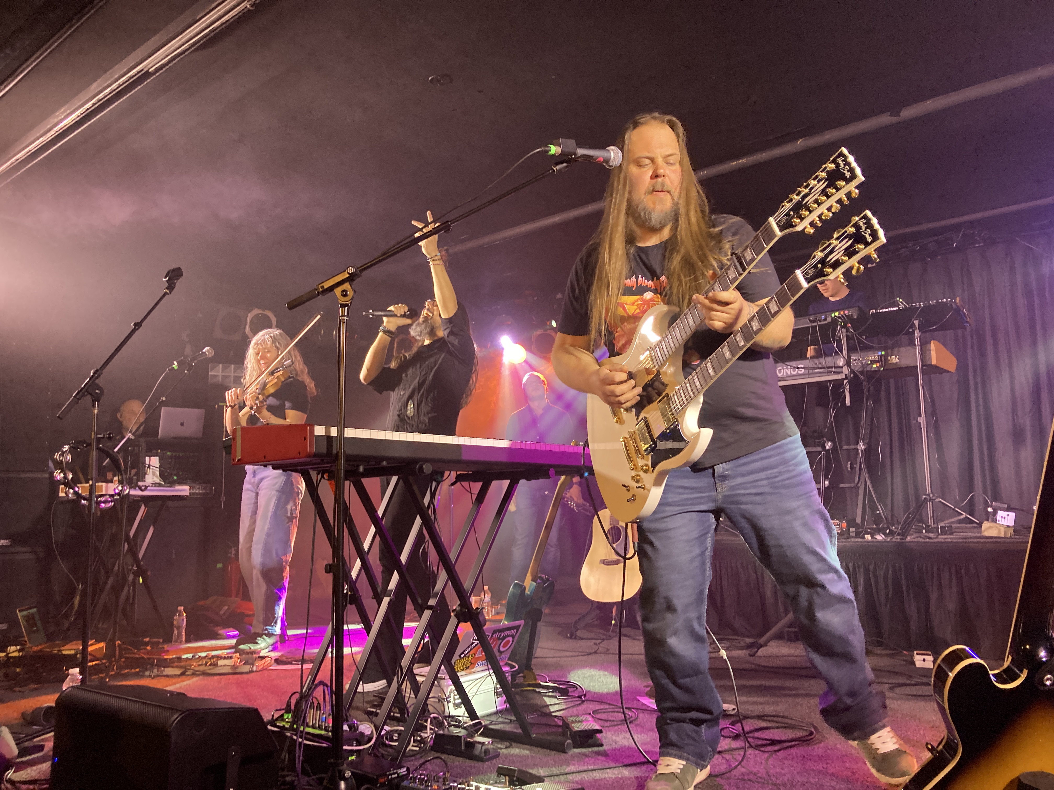 At the back of the stage, keyboardist Oskar Holldorff and bassist/founder Gregory Spawton anchored the music, with Wakemanesque grand piano, sinewy Rickenbacker lines and booming bass pedals laying down track for free passage. To their right, freshly recruited trumpeter Cade Gotthardt covered BBT’s trademark brass parts, sometimes pivoting toward fusion-era Miles Davis fanfares and colors to fresh effect. Up front, Clare Lindley specialized in rippling, quicksilver violin licks; Rikard Sjöblom tackled his own fluid guitar parts plus absent guitarist David Foster’s riffs plus chunky, fiery organ work; and Nick D’Virgilio moved effortlessly from one off-center rhythm to the next, hands and feet awhirl with the rhythmic possibilities. Meanwhile, everyone but Spawton and Gotthardt contributed backing vocals; Bravin, Gotthardt and Lindley added orchestral keyboard pads as needed; and a 12-string guitar purchased at Sweetwater during rehearsals passed between Bravin, D’Virgilio, Lindley, Sjöblom and Spawton as if they’d gathered round a campfire. The cumulative effect kept the audience on the edge of their seats, giddy with the pace and eager for the next inevitable surprise.