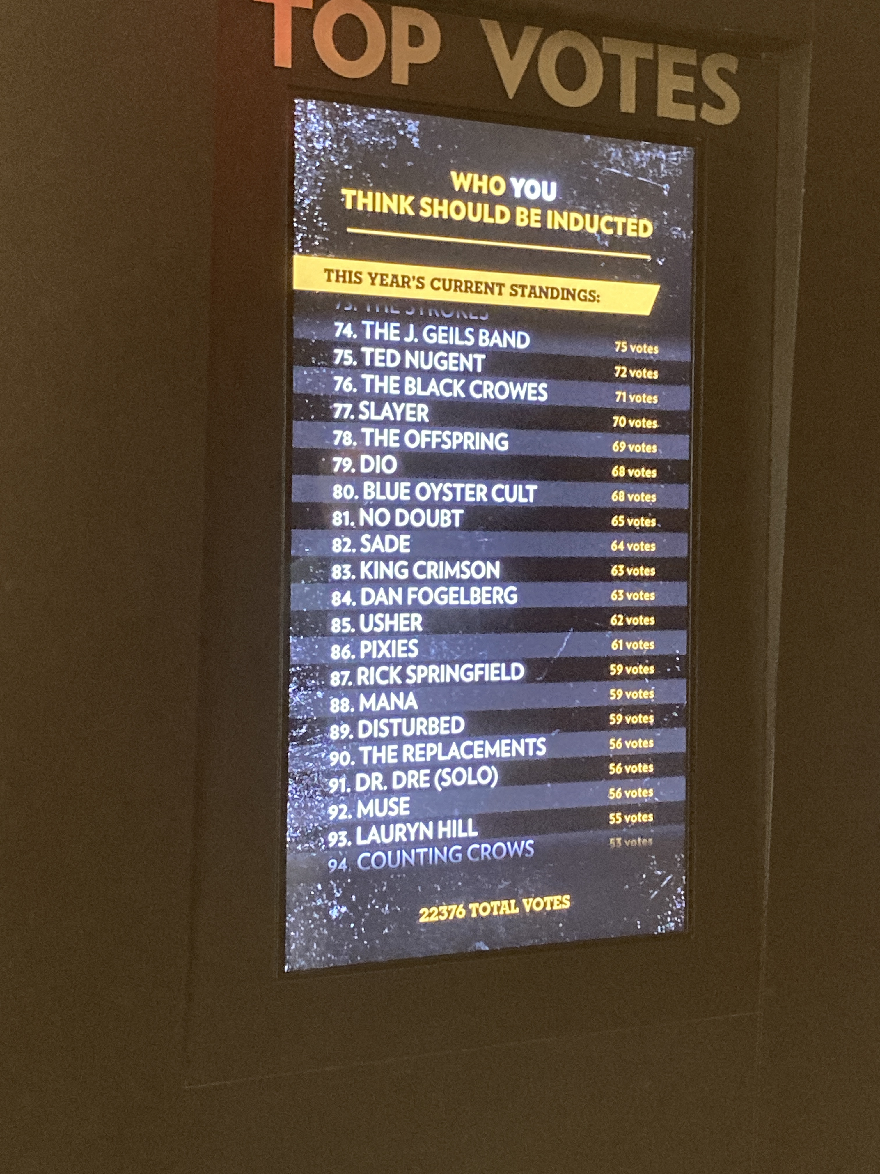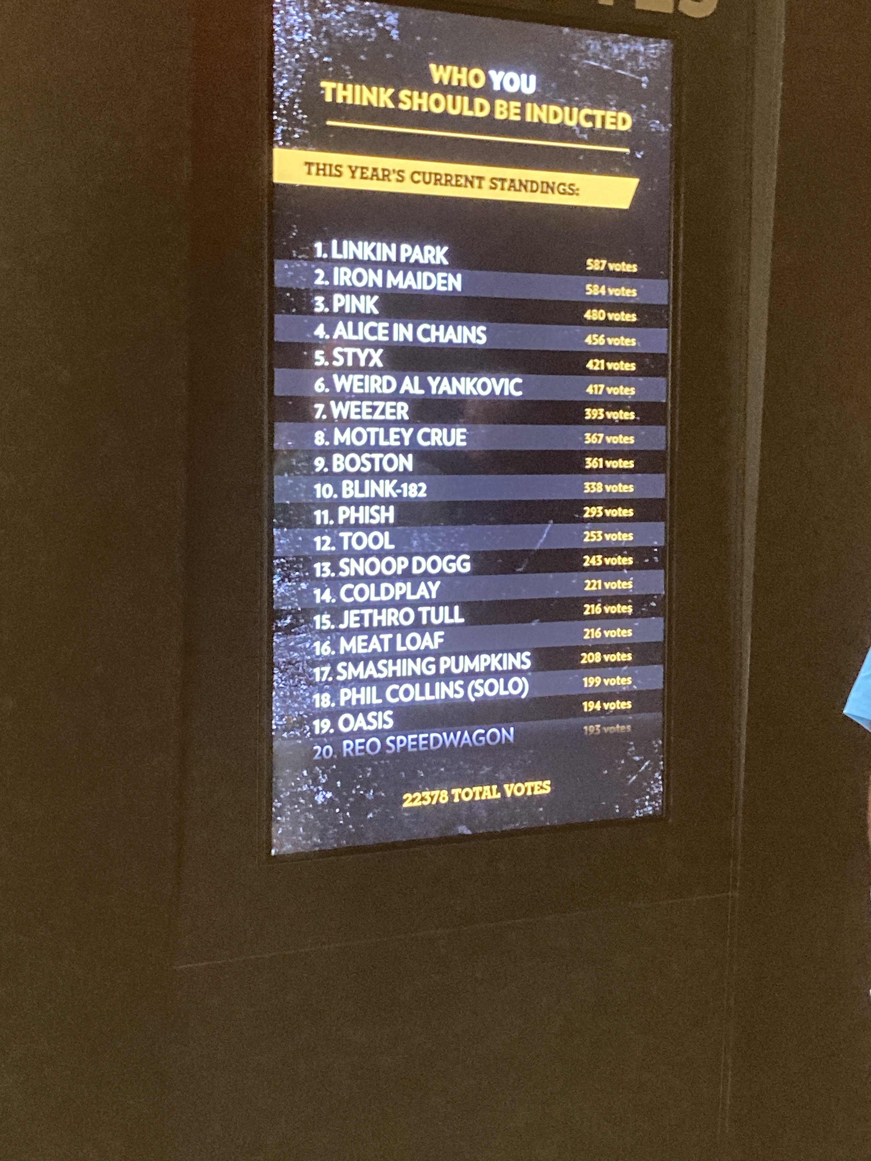 And, doubtless more to harvest email addresses than anything else, you can also vote on who you think should be in the Hall on adjacent video screens. Having done my civic duty by casting a vote for King Crimson, it was heartening to see them at #83 in the Top 100 of this year’s fan poll, though in a lower position than Styx (#5, just in front of Weird Al Yankovic), Tool (#12), Jethro Tull (#15), and Kansas (#35, not pictured). (And sad to say, Emerson Lake & Palmer were nowhere in sight.)