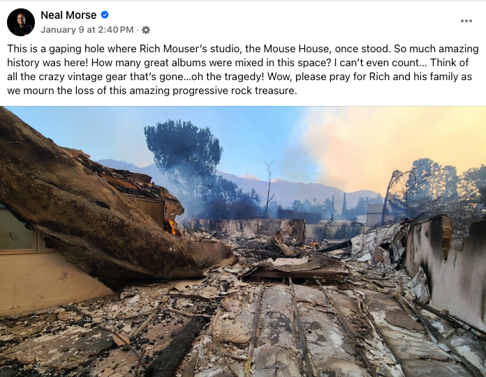 Two weeks ago, the Los Angeles wildfires decimated Rich’s Mouse House Studio. Not only was it his studio but, with his wife Bouchra, they remodeled it over the last couple years to make it their home, as well. Fortunately, the couple was able to evacuate themselves in time, but most of their belongings, including a vast collection of vintage musical equipment (some aged over 60 years) and containing the studio’s centerpiece of a rare 56-input Calrec UA8000 mixing console, were taken in the Eaton fire, located in Altadena, California.
