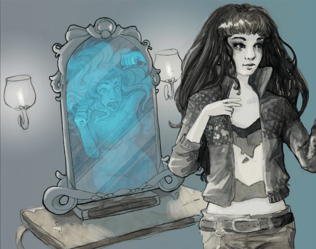 Suzi returns to the mirror and faces her self, finally understanding the power of the ghost, making a connection between worlds and operating her zombie body like a puppet, using her will to control it. They merge, not quite whole but moving together, and slowly march toward Enantiodromia the Reaper. As Suzi gets ever closer, she becomes sick with disease as her body fails. But she marches forward nonetheless, facing the end, she is ready to become whole, if only to die in doing so. Enantiodromia takes her hand. Suzi’s body is destroyed and she dies in a triumphant blaze of glory. (Zombie Connection, Keep Your Head, Day of the Rogue)